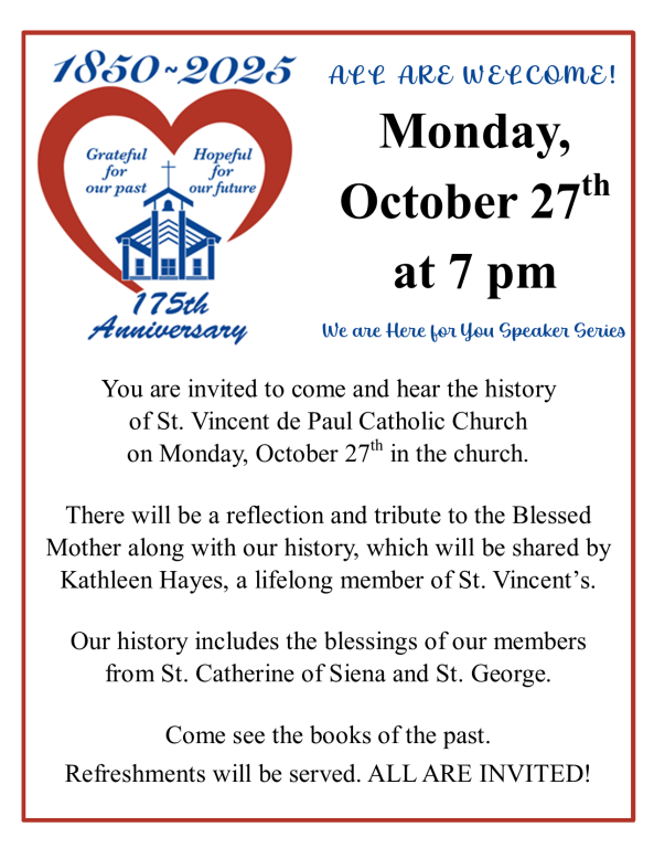 Welcome and thank you for your interest in the parish of St. Vincent de Paul! Whether you’re just visiting the website, looking for a new parish home, returning to the practice of your Catholic faith, or are interested in finding out more about the Catholic Church, we’re happy you are here!