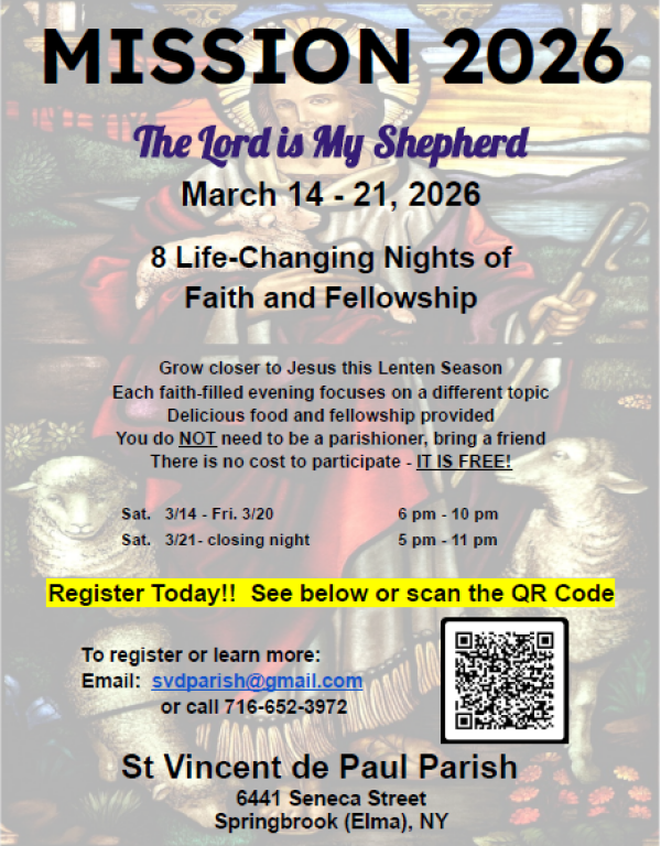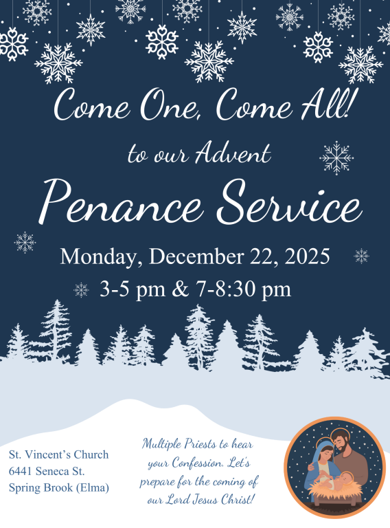 Please see upcoming events happening at St. Vincent's church. This calendar is regularly updated with the most current information regarding things that are taking place. If you have any questions about something listed here, please call Sharon in the rectory at 716-652-3972 or email her at svdparish@gmail.com.