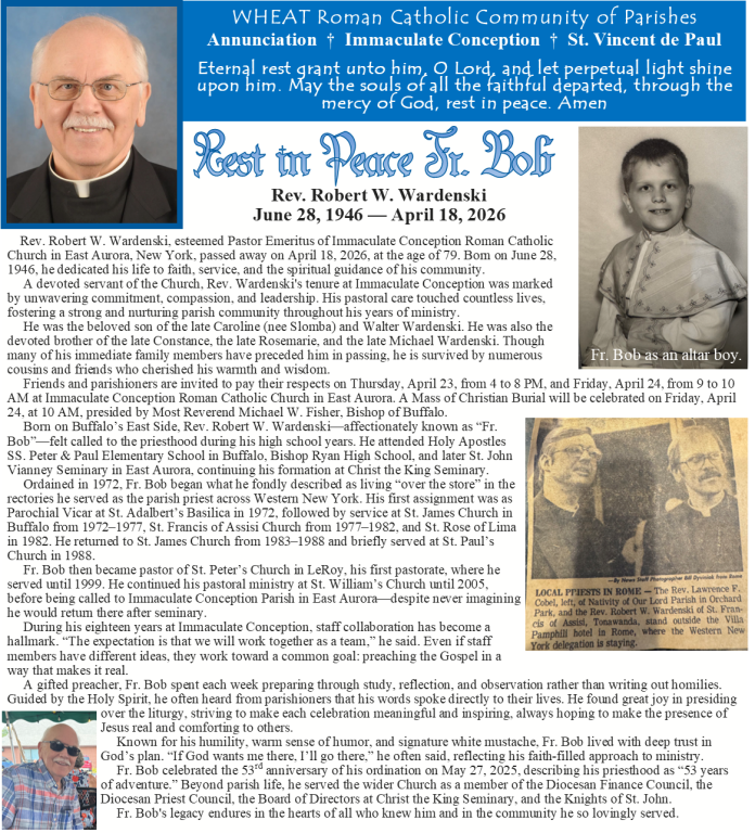Have a look at our online parish calendar. Any questions? Call the Parish Office at (716) 652-3972, we are happy to help. We hope to see you soon!