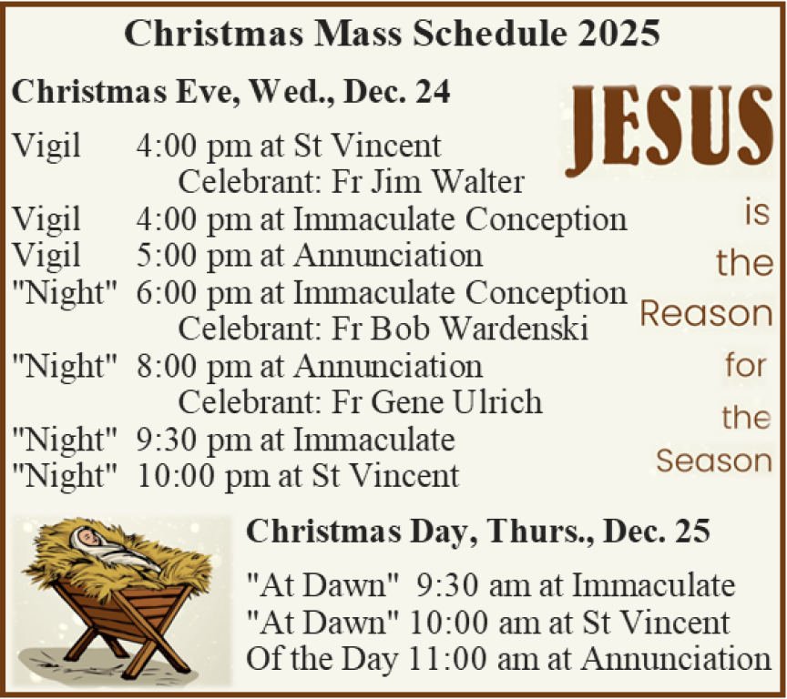 We are accepting ongoing donations for the St. Vincent de Paul Society and St. Luke's Mission of Mercy! Non-perishable food and other small item donations can be dropped off in the red shopping cart in the Church entrance for St. Luke's. New or clean, gently used clothing can be dropped off in small bags in the Society of St. Vincent de Paul's big blue drop-off bins in the parking lot. Thank you for all you do to support our parish and our giving Ministries!